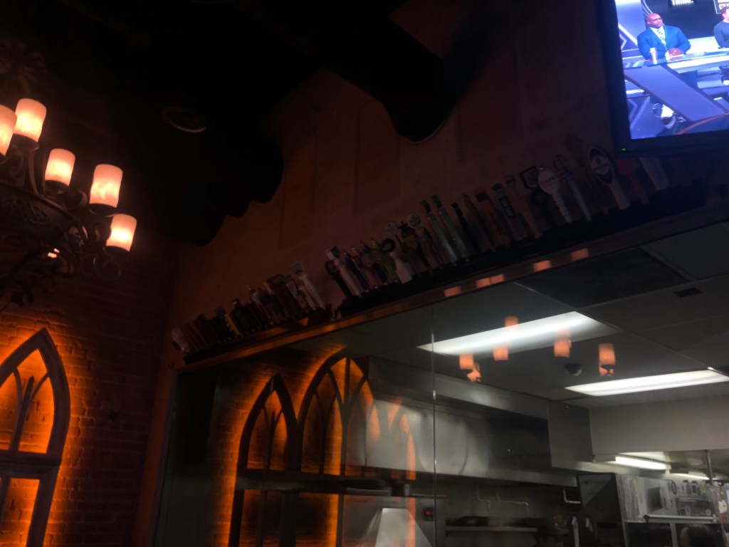 Walking in, the lighting was very low and tavern like. The restaurant was clean and taps of former keg handles could be seen lining the roofs of the place.